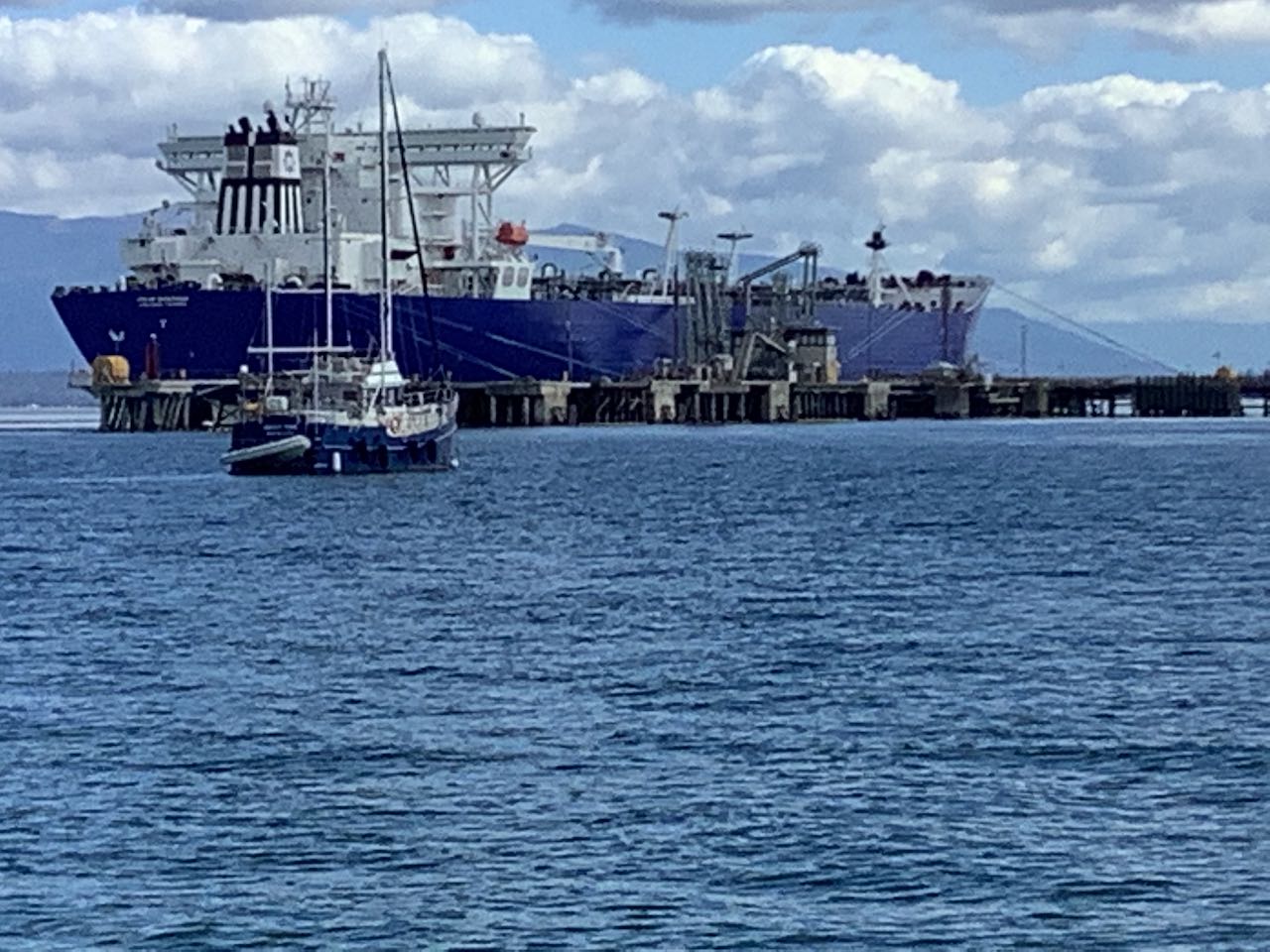 A tanker transferring crude oil to the refinery, and anchored next to us is a Fisher 35, a motor sailer.